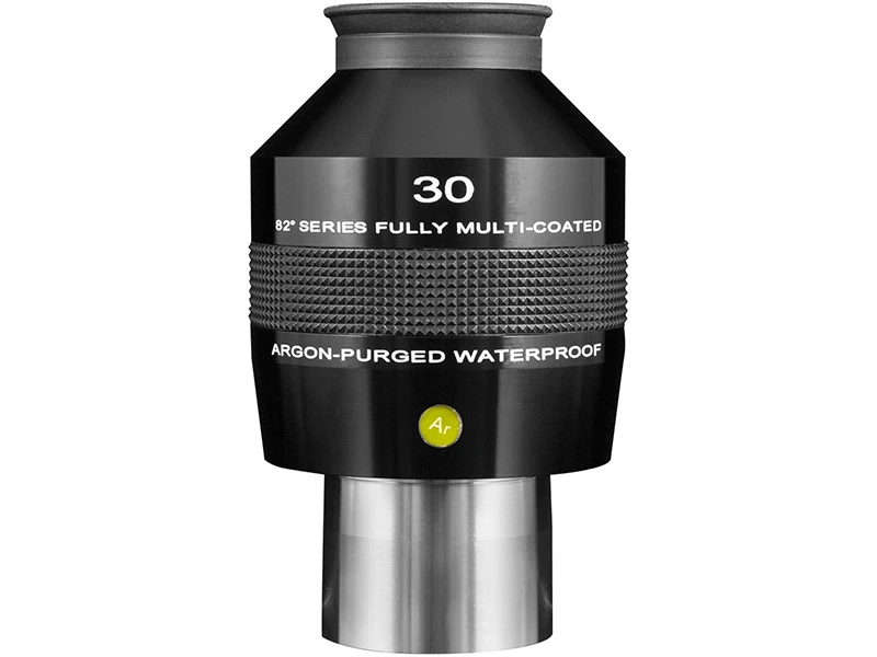 The 30mm 82° Series Waterproof Argon-Purged Eyepiece is a popular focal length in the upper-medium power magnification class providing both super-wide apparent field and generous eye relief. It is perfect for any application where more power is desired including observing globular star clusters, planetary nebulae, the bright cloud structure near the nucleus of comets, initial observations of planets, and (with the proper safe filtration on your telescope), observations of active regions of the sun. Use with Explore Scientific Focal Extenders for 2X, 3X, or 5X magnification increases while maintaining the eyepiece native apparent field and eye relief.