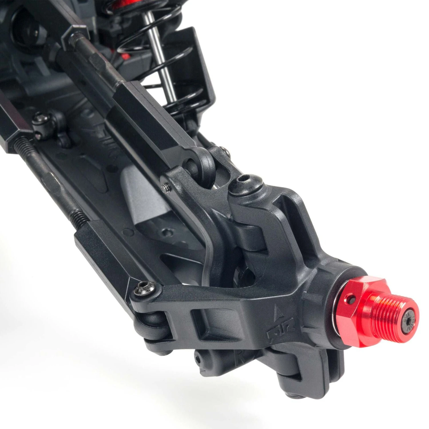 The footprint of this KRATON® 4X4 4S BLX Speed Monster Truck is 16% larger than the previous model, with higher shock towers, longer shocks, and wider suspension arms for longer, more plush suspension travel. The strength of the transmission has been bolstered with the inclusion of steel gearbox input gears, steel main diff gears and CVD Driveshafts.