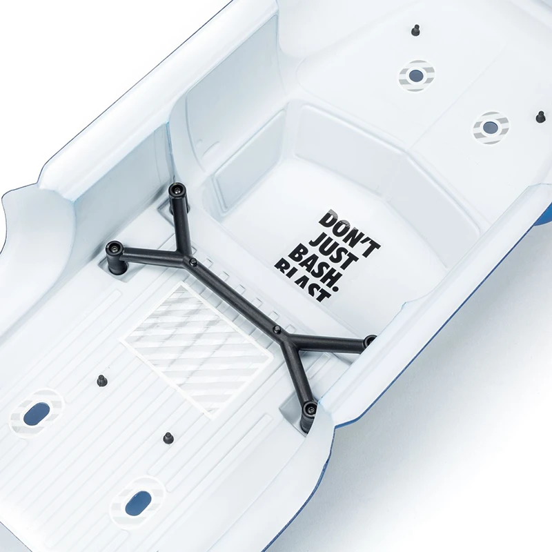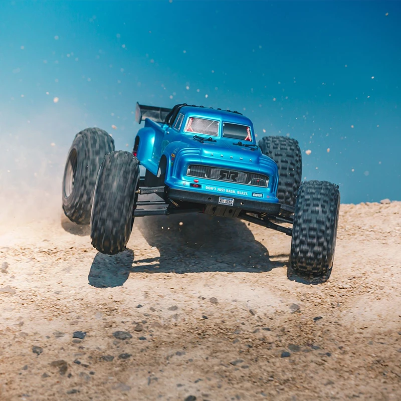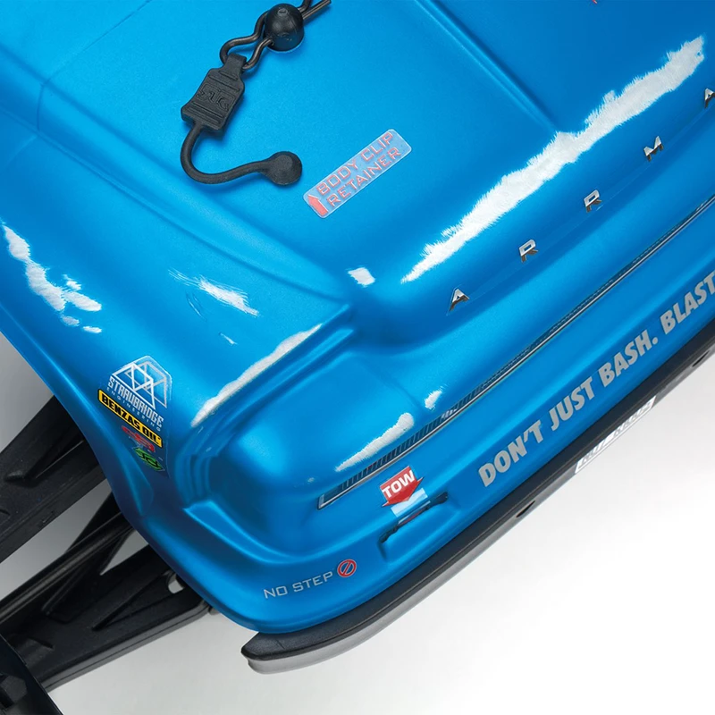 For the durability needed to support extreme stunts, ARRMA® uses a strong anodized aluminum chassis as the foundation. A new center body support and aluminum center brace plus composite chassis side pods add more strength. All-metal diff outdrives and gearbox internals plus durable steel driveshafts provide a reliable, heavy-duty drivetrain that holds up to extreme stunts and high-speed bashing. A new “never loose” aluminum steering servo saver and “never pop” ball ends supply more precision, reliability and confidence.