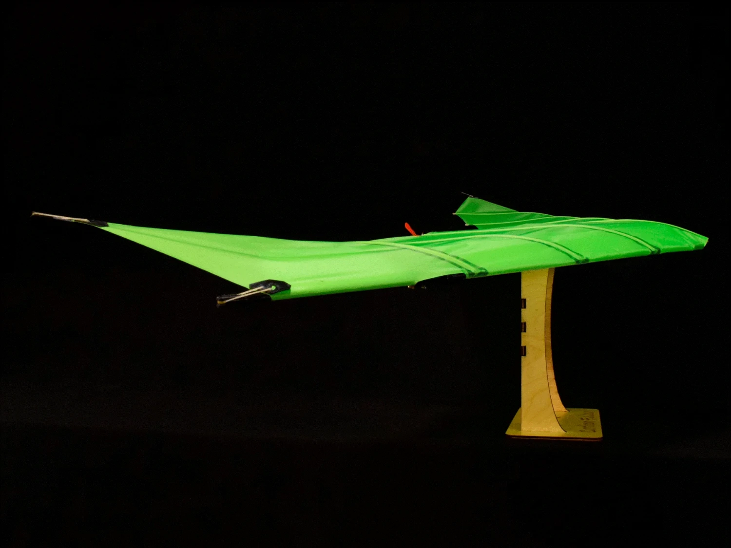 Unlike a conventional aircraft, the Carbon Falcon has no control surfaces. High torque servos drive torque tubes that warp the trailing edge for the maneuverability of a bird, making it look almost alive in flight.