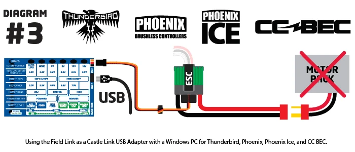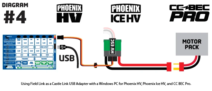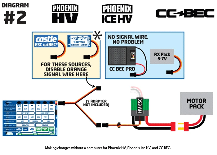 - CC BEC does not supply output power when connected to the Castle Link or Field Link. It must therefore be powered with a Y harness like the HV ESC in diagram 2 for field use. The motor pack is not required for this specific setup.