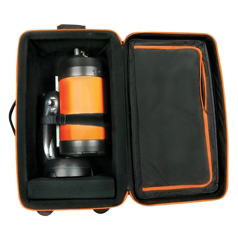 The case is EVA molded to protect your telescope with a hard, yet flexible shell. An expandable storage zipper pocket allows you to carry all your telescope’s standard accessories. Inside the case, two dense foam spacers and a built-in compression strap help you customize the case for each telescope model. The case also includes wheels and an extendable handle for easy transportation.