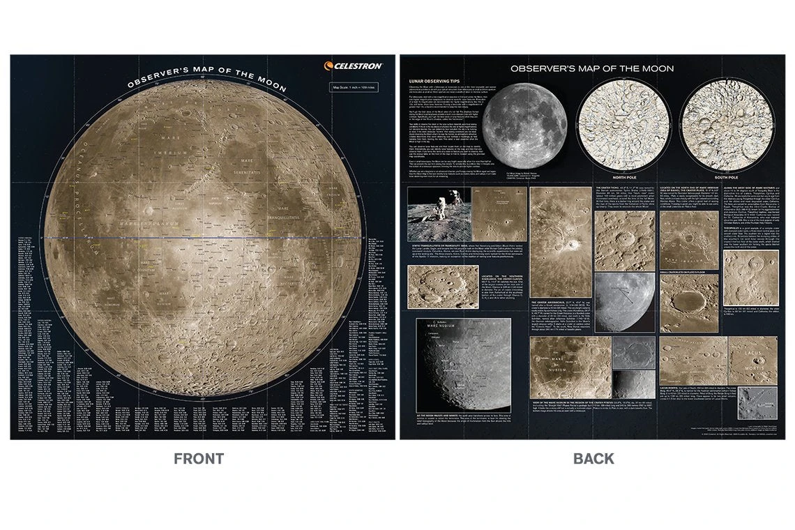 Celestron has joined forces with master lunar cartographer Ralph Aeschliman on a two-sided Moon Map. This quality map provides you a great way to familiarize yourself with the Moon, our neighboring world. Whether you are looking for Lacus, Maria, Montes, or Valles, the Moon map will help you navigate the lunar landscape with confidence. You can observe features with your telescope and locate them on the map or vice versa. This map also features a directory of all the key lunar regions with coordinates to find them.