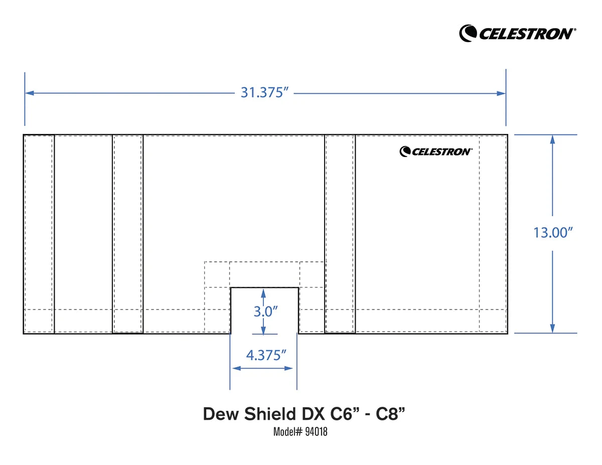 The Dew Shield DX provides a perfect, custom fit designed specifically for 6” and 8” Celestron optical tubes. The Dew Shield is built from durable PE plastic that is flexible but strong. Extra padding has been added at the tube attachment edge to create a stronger fit on the optical tube. The felt-lined interior absorbs any additional stray light and excessive moisture, creating optimal contrast when viewing and imaging. The large dovetail cutout has been made both wider- to accommodate a 4” wide dovetail rails, as well as deeper, to create a more solid connection with the optical tube.