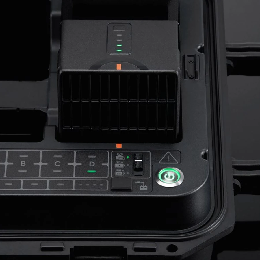 The battery station is a one-stop solution for battery charging, storage, and transport. The new Storage Mode and Ready-to-Fly Mode improve charging efficiency and extend the battery life. The new 360°-movement wheels facilitate more convenient transportation and transitions. The battery station provides eight TB65 battery ports, four WB37 battery ports, one USB-C maintenance port, one USB-C charging port, and one USB-A charging port. It can charge up to two TB65 batteries and one WB37 battery simultaneously.