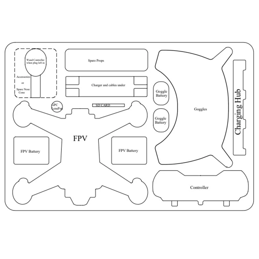 Our case packs the DJI FPV Combo configuration which includes Goggles, 2 spare Batteries, Charger Hub, Standard Controller & the Motion Controller, spare props, plus the *GPC Micro SD Card Holder & *GPC LensPen MicroPro and much more. For those of you not purchasing the Motion Controller, just remove the perforated block of foam and you will have a great additional accessory space.