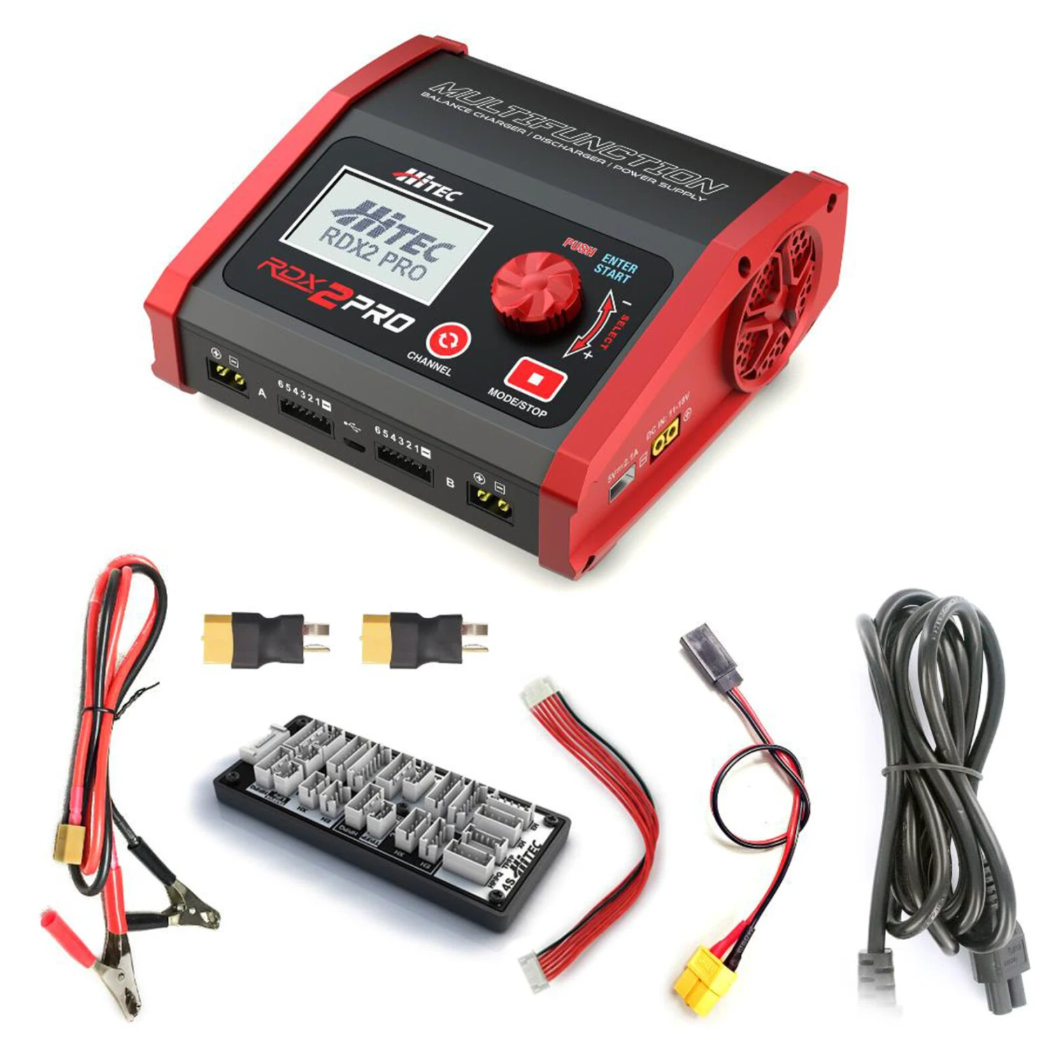 Hitec’s popular RDX charger line continues to expand with the introduction of our RDX2 Pro, a dual port AC/DC charger providing a whopping 260 watts of power! The RDX2 Pro features independent, 130-watt circuits, allowing you to charge two packs simultaneously. Its user-friendly Jog Dial easily scrolls through menus, making programming a breeze. Capable of charging 2S packs at rates up to 14 amps, and 4S packs up to 9 amps, the RDX2 Pro’s high charge rates provide more power in less time for your 1/8th and 1/10th-scale Buggy and Truggy needs.