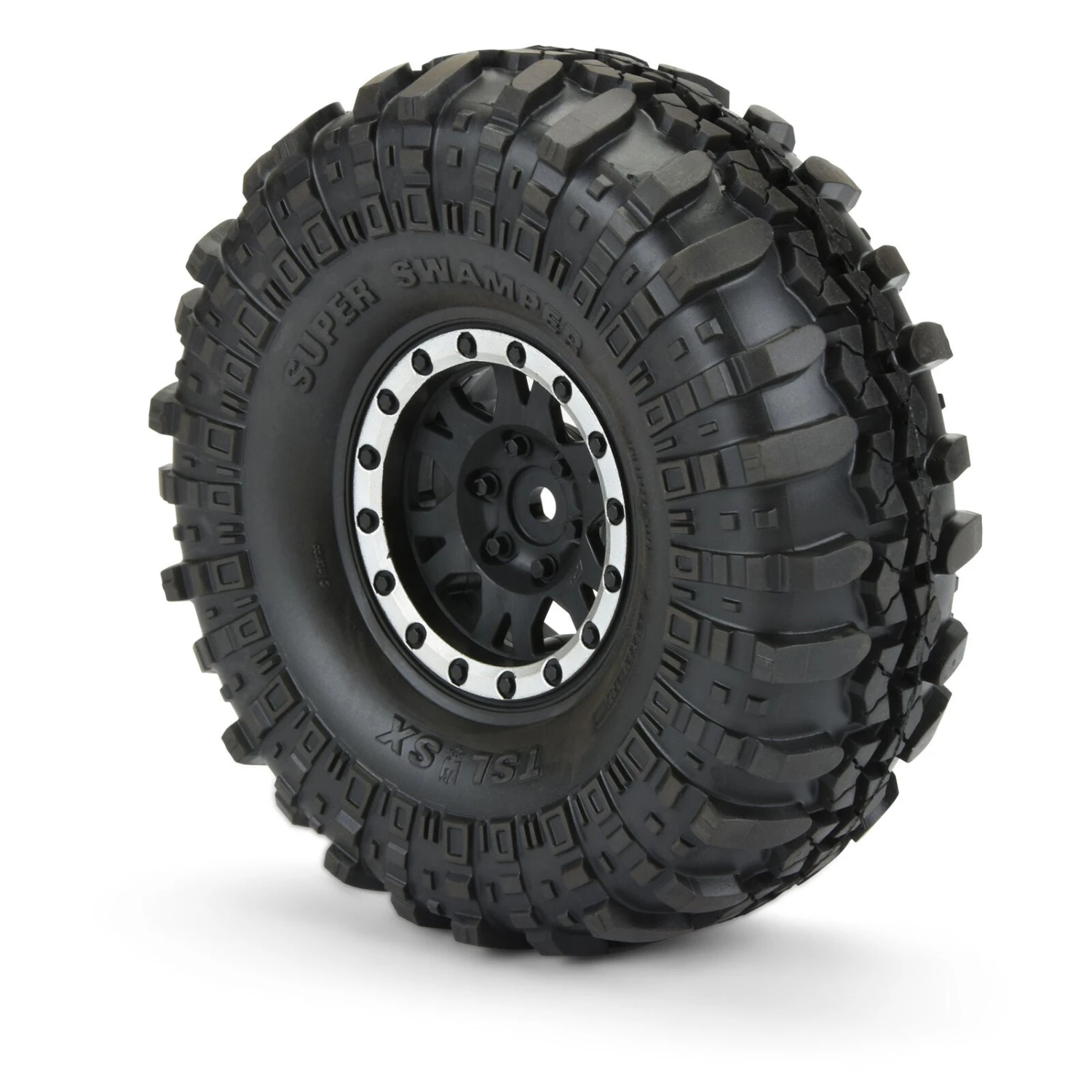 This is a Pre-mounted pair of 1.9″ Super Swamper® XL Tires for Rock Crawling. Under official license from Interco® Tire Corporation, Pro-Line is proud to announce the 1.9″ TSL SX Super Swamper® XL in the legendary G8 compound now available mounted on Impulse Black/Silver internal Bead-Loc wheels. With ” almost scale” not being acceptable and access to Interco’s design data, Pro-Line’s engineering staff has reproduced the Super Swamper® in a scale configuration matched by none. The 1.9″ XL is perfect for scale crawlers that want maximum ground clearance and unmatched rock crawling performance.
