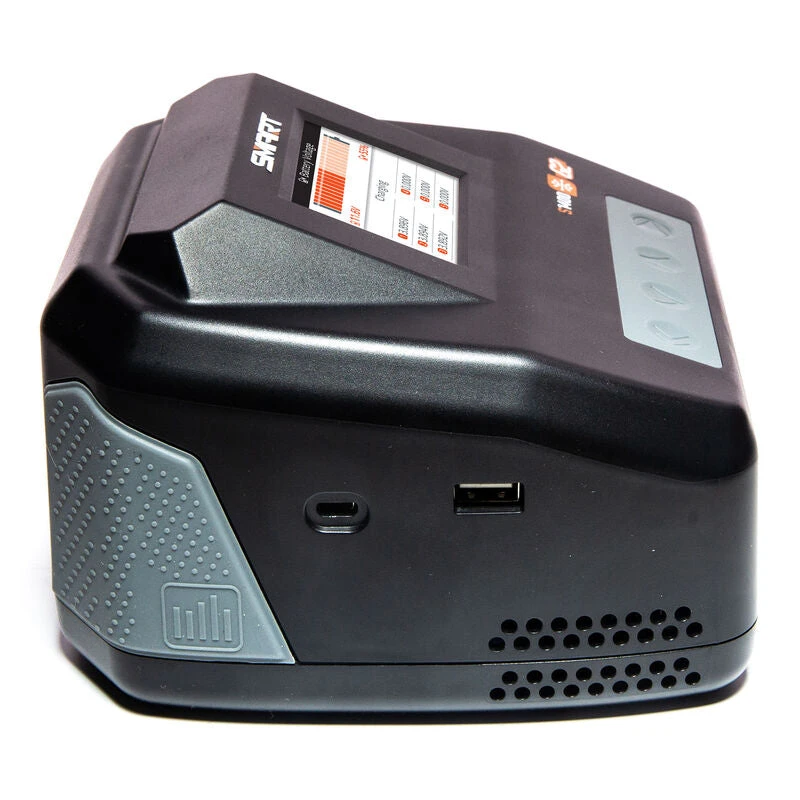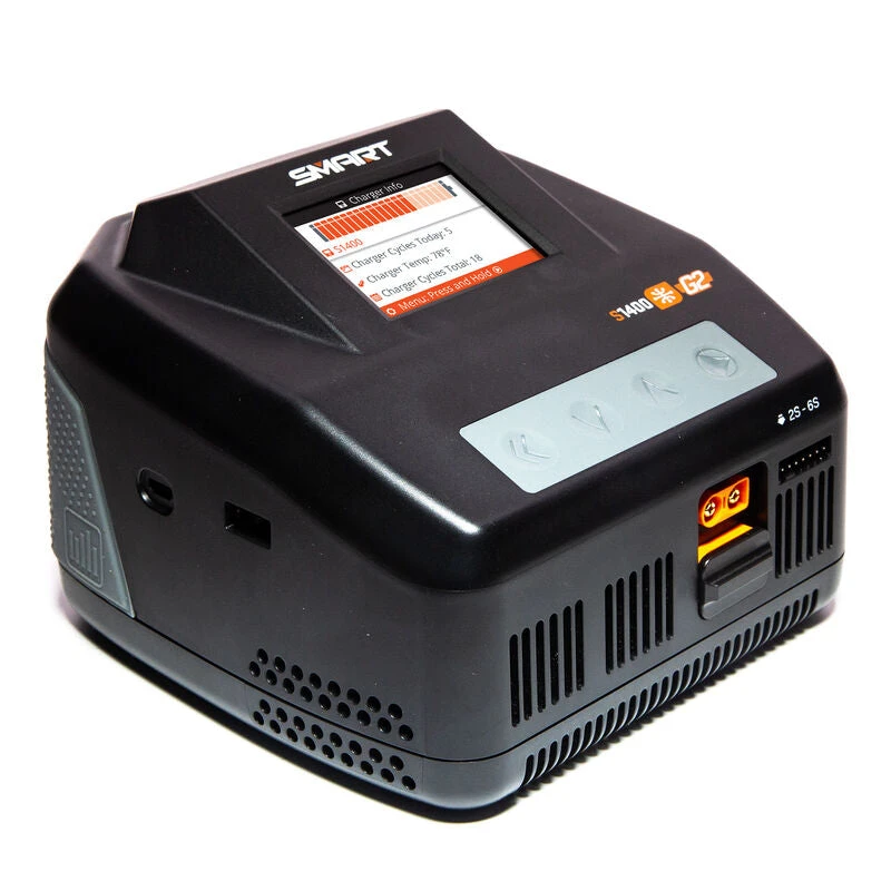 | In real time, a clock on the S1400 G2 AC charger’s screen counts down the minutes until your Smart battery is fully charged and ready to be used. | Â | The charger’s sleek case fits perfectly on your workbench and in your pit or field bag. Its power cord is detachable for easy transport. Rubber grips help you hold the charger securely while connecting and removing batteries. USB input and output ports enable you to update charger firmware and to charge secondary devices. Other features include a built-in ON/OFF power switch and low-noise cooling fan. |