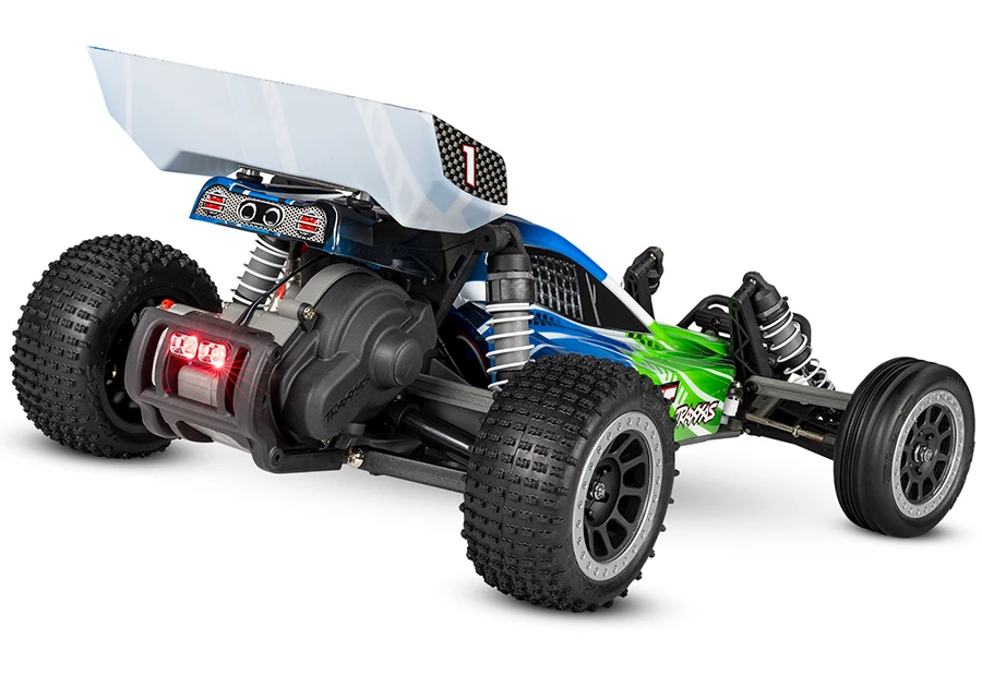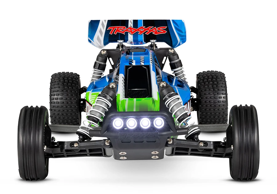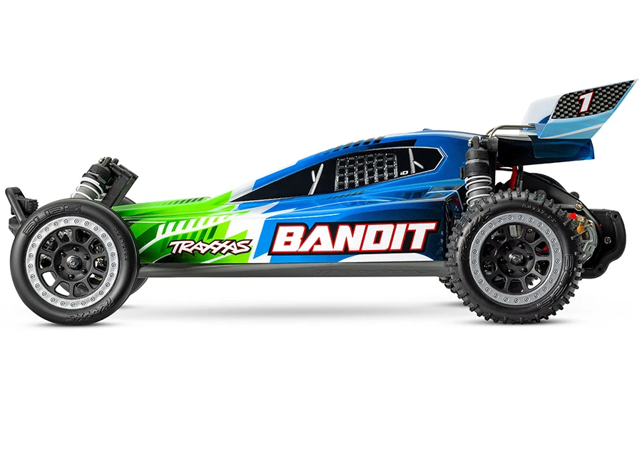 The Traxxas Bandit® elevates RC buggy performance to a whole new level with faster speeds, innovative technology, hobby-grade durability, and a budget-friendly price. Bandit’s sleek, lightweight chassis delivers razor-sharp handling and blazing 35+ MPH* speed with blazing LED lights to guide the way. Pull the trigger and the Bandit rips massive rooster tails, soars over jumps, and lays down the power for excitement at every turn. Equally at home off-road or on pavement, Bandit’s fully waterproof electronics make even the wildest all-weather adventures possible. Step up to genuine Traxxas quality and performance and discover a whole new level of fun with the Traxxas Bandit.