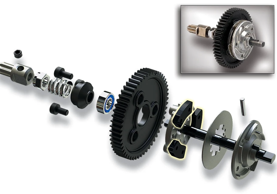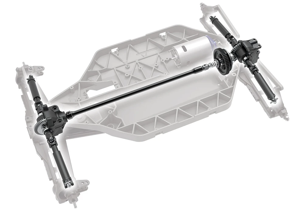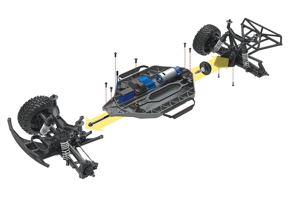 Old designs made servicing of 4-wheel drive vehicles cumbersome and time-consuming. Traxxas has a better way. Modular design allows the entire front section to be removed with just 5 screws, and the rear assembly with just 4 screws. In less than a minute using a power screwdriver, you have full access for easy service and adjustment.