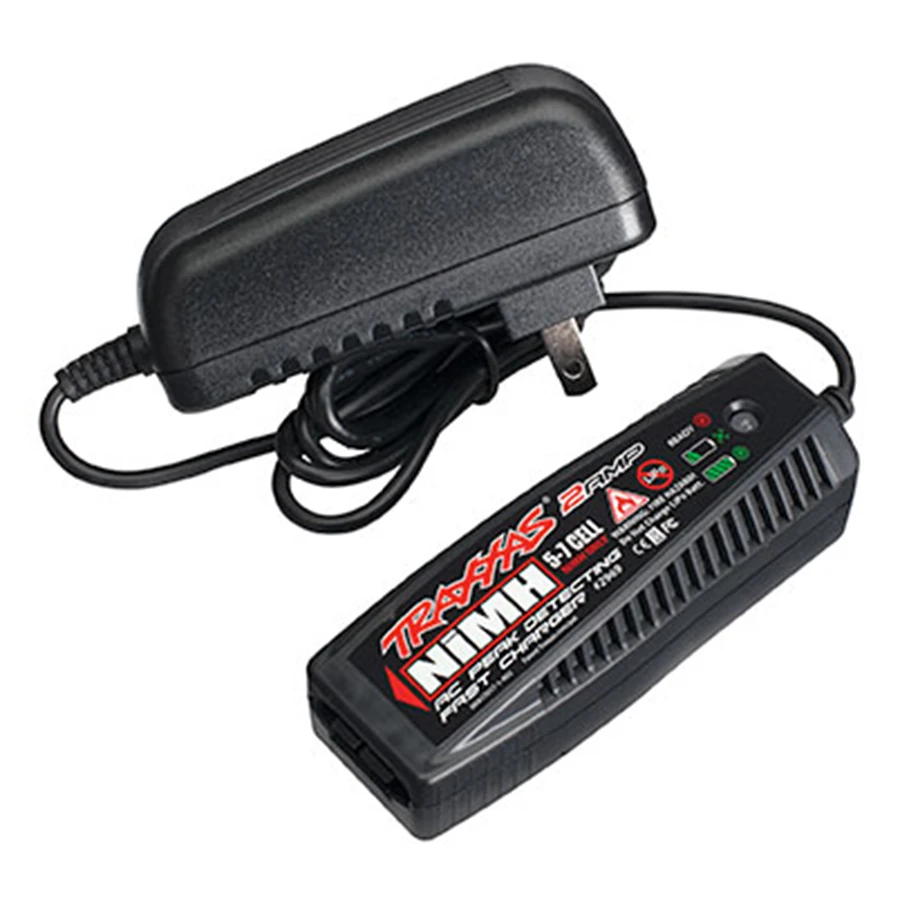 Traxxas 7-Cell NiMH battery and 2-Amp AC charger for models compatible with long battery packs. For use in vehicles with 164 mm battery trays.