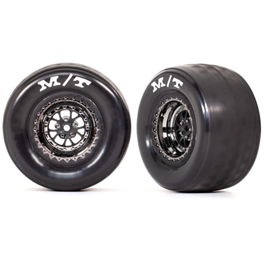 Wide Mickey Thompson drag slicks come pre-glued to black chrome Weld wheels to replicate the legendary look and performance of the real thing. Developed with extensive testing, the slicksā unique compound is formulated to balance long tire life with maximum traction.